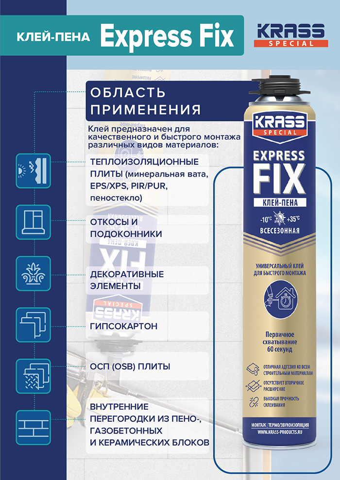 Клей предназначен для качественного и быстрого монтажа различных видов материалов: теплоизоляционные плиты (минеральная вата, EPS/XPS, PIR/PUR, пеностекло), откосы и подоконники, декоративные элементы, гипсокартон, ОСП (OSB) плиты, внутренние перегородки из пено-, газобетонные и керамические блоки.
